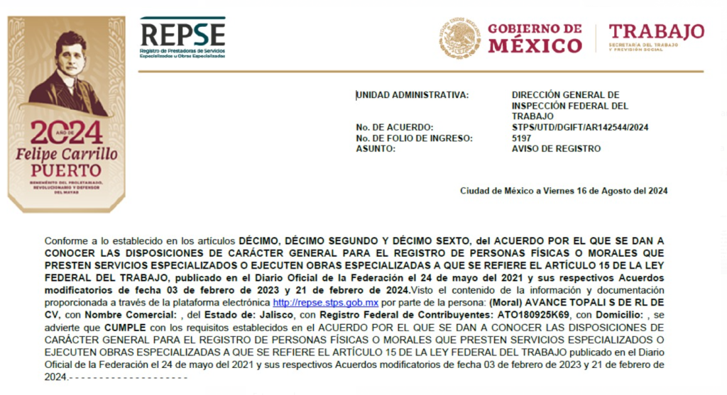 Este registro garantiza que nuestra empresa opera conforme a la ley, evitando prácticas de outsourcing ilegal y asegurando los derechos laborales de nuestros colaboradores.
